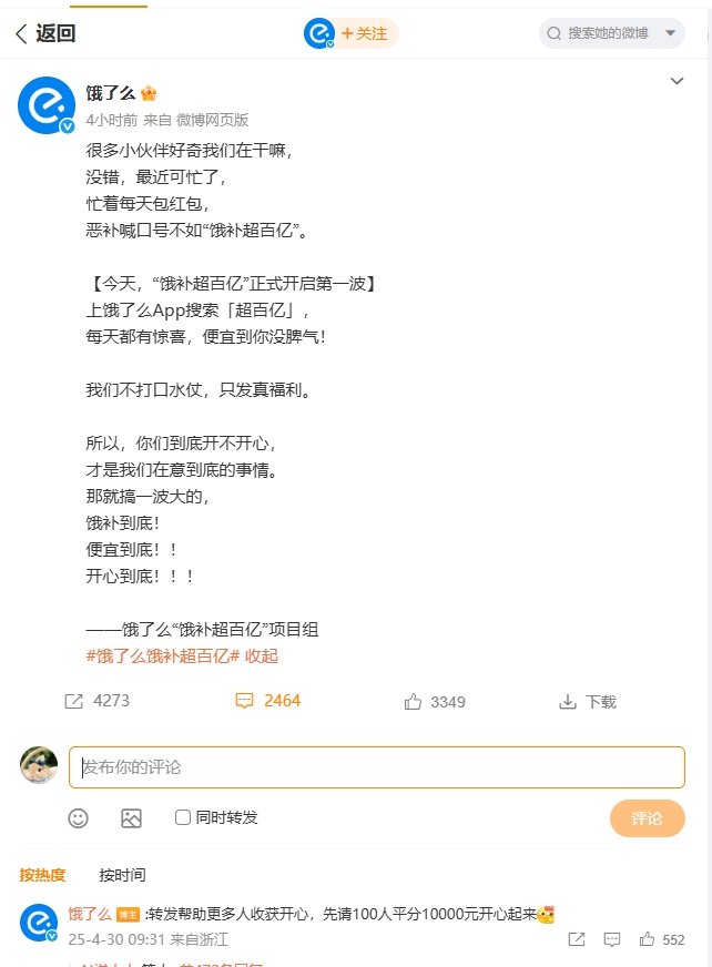 那么,实质性的迎战措施有什么?根据饿了么的说法,4月30日正式开启第一波“饿补超百亿”活动,并表示“便宜到底”。
